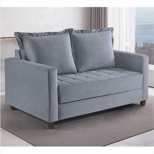 Disponivel no modelo casal, o sofa cama Frisa atende a todos os perfis de usuario. Os Pes de madeira dao a sustentacao e confianca necessaria, alem de almofadas soltas para facilitar no seu manuseio.