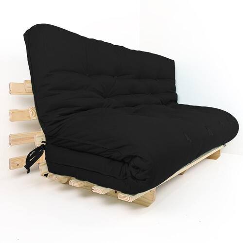 Material e estrutura: O colchão futon king é fabricado em tecido de alta qualidade em acquablock impermeável, seu enchimento é de mantas de algodão natural, manta fibra siliconada estruturado por espuma ortopédica D28. Possui amarras nas extremidades, a estrutura é produzida em madeira maciça de pinus sem pintura.