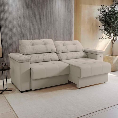 Para o máximo de conforto, aposte no Sofá Stelo da Kappesberg. Com assentos retráteis e espumas para o máximo de maciez e aconchego, o encosto é articulado em três posições, permitindo o ajuste conforme sua preferência. Já os braços, com acabamento estofado, unem beleza e comodidade para compor seu espaço. Com estrutura em madeira de eucalipto, medindo 1,14m de altura, 2,3m de largura e 96cm de profundidade, é perfeito para acomodar a família e amigos, deixando cada momento mais completo.