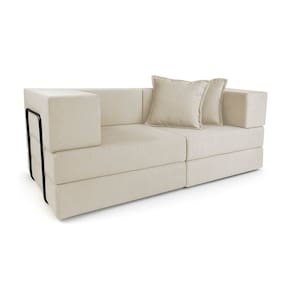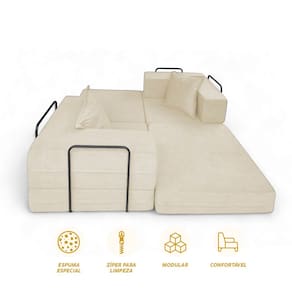 As laterais funcionam como encosto acolchoado, oferecendo apoio para relaxar, ler ou ver TV. Por ser leve e modular, é ideal para salas pequenas, quartos, e áreas multiuso, trazendo praticidade ao dia a dia.