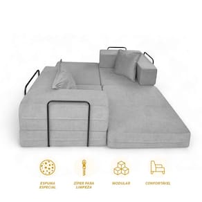 As laterais funcionam como encosto acolchoado, oferecendo apoio para relaxar, ler ou ver TV. Por ser leve e modular, é ideal para salas pequenas, quartos, e áreas multiuso, trazendo praticidade ao dia a dia.