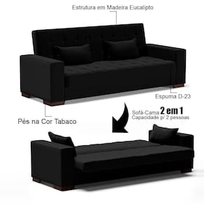 Escolher o Sofá cama correto pode ser uma tarefa difícil, pois, dependem de muitos fatores como espaço disponível, conforto, beleza e tipo do tecido, para te ajudar, apresentamos o Sofá Cama Lisboa! Ele possui 2 posições podendo ser utilizado como sofá e também como cama, caso receba alguma visita que venha passar a noite. Ele é produzido em madeira de eucalipto, seu estofamento apresenta todo o conforto da espuma D-23 e o assento é composto com percintas elásticas garantindo qualidade e durabilidade ao produto.