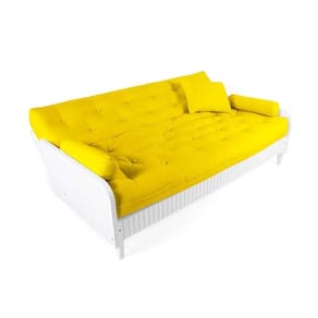 Material e estrutura: O colchão futon casal é fabricado em tecido de alta qualidade em Sarja Peletizada, seu enchimento é de mantas de algodão natural, manta fibra siliconada estruturado por espuma ortopédica D28. Possui amarras nas extremidades. A estrutura é produzida em madeira nobre grápia com pintura na cor branca.