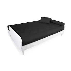 Material e estrutura: O colchão futon casal é fabricado em tecido de alta qualidade em Sarja Peletizada, seu enchimento é de mantas de algodão natural, manta fibra siliconada estruturado por espuma ortopédica D28. Possui amarras nas extremidades. A estrutura é produzida em madeira nobre grápia com pintura na cor branca.