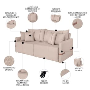 Revestido com o mais fino linho, oferece uma textura suave ao toque, enquanto os detalhes em sintético nos braços adicionam um toque de sofisticação. Os botões de madeira cuidadosamente inseridos destacam-se, proporcionando um visual clássico e atemporal. Para garantir o máximo conforto em sua Sala De Estar, este Sofá 3 Lugares acompanha almofadas e encosto com plumante, percintas elásticas e molas Bonnell, que juntas criam uma experiência de assento e sono excepcional. Os pés 3cm em madeira cor mel cor mel não só reforçam a robustez da estrutura, mas também complementam o design com sua beleza natural. Ah! Além de tudo, esse Sofá Retrátil possui rodízios em silicone facilitando a abertura. Ideal para quem busca praticidade sem abrir mão do estilo, este sofá-cama é uma adição luxuosa a qualquer ambiente.