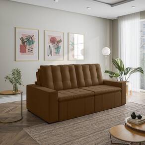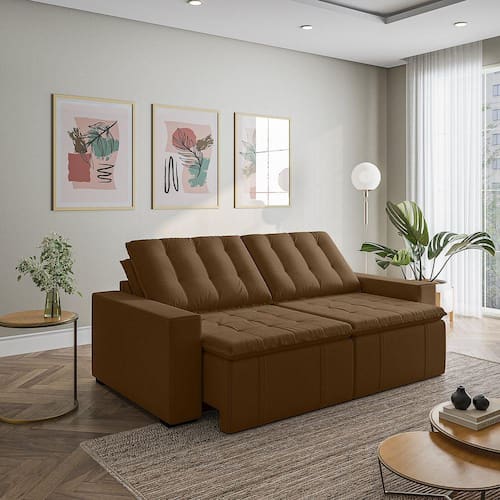 O Sofá Cama Palmeira MadeiraMadeira é a solução perfeita para quem tem pouco espaço disponível. Com ele você poderá acomodar suas visitas com conforto e praticidade. Produzido em madeira maciça de eucalipto, suporta até 400kg. Depois nos conte como foi a experiência de compra e como ficou seu ambiente nos comentários! Acompanha Almofadas extras: Não Almofada do assento: Fixa Almofada do encosto: Removível Altura do assento até o chão: 48 Altura do Encosto: 58 Altura dos Pés: 3 Ambiente Principal: Sala de Estar Complexidade da Montagem: Baixa: pode ser montado por uma pessoa sozinha Cor: Marrom Cor do Produto: Marrom Densidade do Assento: D-23 Densidade do Encosto: Camadas de Densidades Diferentes Enchimento do Assento: Espuma Enchimento do Encosto: Fibra Siliconada Estilo de Braço: Braços Quadrados Firmeza do Assento: Médio Informações Complementares: Densidade Braço D19. Enchimento do encosto: fibra siliconada com flocos de espuma envolvidas com manta siliconada. Itens Inclusos: 1 Sofá, Kit Ferragens e Manual de Montagem Linha ou Coleção: Palmeira Manual de Montagem e Instalação: https://product-hub-prd.madeiramadeira.com.br/879717/documents/793f2300-e7ac-4041-827c-8d13a47db397palmeira240260280bracoreto.pdf Material dos Pés: Polimero Modelo: Retrátil e Reclinável Necessita Montagem: Sim Nível de Conforto: Macio Origem do Produto: Nacional Peso: 87 Pet Friendly: Não Possui Entrada USB: Não Possui Percintas Elásticas: Sim Possui Pés: 08 Possui Rodízio: Sim Profundidade Quando Estendido: 148 Recomendações de Uso, Manutenção e Limpeza: Evitar exposição direta à luz solar, limpar com escova macia e aspirar o pó semanalmente, não utilizar produtos químicos, removedores, alvejantes, etc. Evite exercer pressão excessiva sobre determinada partes do estofado, não utilizar para limpeza equipamentos a vapor de água. Resistente à Chuva: Não Revestimento do Braço: Veludo Rodízio com Trava: Não Sistema de Montagem: Parafusos e Engates Tecido Predominante: Veludo Tipo de Encosto: Regulável Tipo de Mola: Molas Bonnel