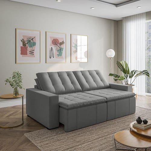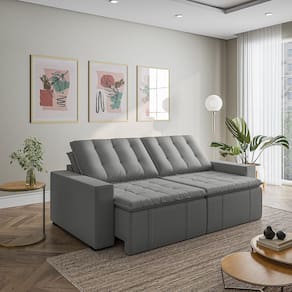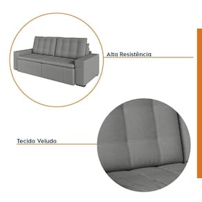 O Sofá Cama Palmeira MadeiraMadeira é a solução perfeita para quem tem pouco espaço disponível. Com ele você poderá acomodar suas visitas com conforto e praticidade. Produzido em madeira maciça de eucalipto, suporta até 400kg. Depois nos conte como foi a experiência de compra e como ficou seu ambiente nos comentários! Acompanha Almofadas extras: Não Almofada do assento: Fixa Almofada do encosto: Removível Altura do assento até o chão: 48 Altura do Encosto: 58 Altura dos Pés: 3 Ambiente Principal: Sala de Estar Complexidade da Montagem: Baixa: pode ser montado por uma pessoa sozinha Cor: Cinza Cor do Produto: Cinza Densidade do Assento: D-23 Densidade do Encosto: Camadas de Densidades Diferentes Enchimento do Assento: Espuma Enchimento do Encosto: Fibra Siliconada Estilo de Braço: Braços Quadrados Firmeza do Assento: Médio Informações Complementares: Densidade Braço D19. Enchimento do encosto: fibra siliconada com flocos de espuma envolvidas com manta siliconada. Itens Inclusos: Sofá, 8 pés e Manual de Montagem Linha ou Coleção: Palmeira Manual de Montagem e Instalação: https://product-hub-prd.madeiramadeira.com.br/877886/documents/5377dda9-8326-4994-97cb-ea4edf352da1782ManualSofPalmeira240alt.pdf Material dos Pés: Polimero Necessita Montagem: Sim Nível de Conforto: Macio Origem do Produto: Nacional Peso: 92 Pet Friendly: Não Possui Entrada USB: Não Possui Percintas Elásticas: Sim Possui Pés: 08 Possui Rodízio: Sim Profundidade Quando Estendido: 148 Recomendações de Uso, Manutenção e Limpeza: Evitar exposição direta à luz solar, limpar com escova macia e aspirar o pó semanalmente, não utilizar produtos químicos, removedores, alvejantes, etc. Evite exercer pressão excessiva sobre determinada partes do estofado, não utilizar para limpeza equipamentos a vapor de água. Resistente à Chuva: Não Revestimento do Braço: Veludo Rodízio com Trava: Não Sistema de Montagem: Parafusos e Engates Suporta Até (kg): 200 Tecido Predominante: Veludo Tipo de Encosto: Regulável Tipo de Mola: Molas Bonnel Ean: 7909903474853