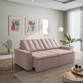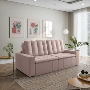 O Sofá Cama Palmeira MadeiraMadeira é a solução perfeita para quem tem pouco espaço disponível. Com ele você poderá acomodar suas visitas com conforto e praticidade. Produzido em madeira maciça de eucalipto, suporta até 400kg. Depois nos conte como foi a experiência de compra e como ficou seu ambiente nos comentários! Acompanha Almofadas extras: Não Almofada do assento: Fixa Almofada do encosto: Removível Altura do assento até o chão: 48 Altura do Encosto: 58 Altura dos Pés: 3 Ambiente Principal: Sala de Estar Complexidade da Montagem: Baixa: pode ser montado por uma pessoa sozinha Cor: Rosa Cor do Produto: Rosa Densidade do Assento: D-23 Densidade do Encosto: Camadas de Densidades Diferentes Enchimento do Assento: Espuma Enchimento do Encosto: Fibra Siliconada Estilo de Braço: Braços Quadrados Firmeza do Assento: Médio Informações Complementares: Densidade Braço D19. Enchimento do encosto: fibra siliconada com flocos de espuma envolvidas com manta siliconada. Itens Inclusos: Sofá, 8 pés e Manual de Montagem Linha ou Coleção: Palmeira Manual de Montagem e Instalação: https://product-hub-prd.madeiramadeira.com.br/877889/documents/f963a146-9317-4335-b827-9e278cbf9ebe785ManualSofPalmeira240alt.pdf Material dos Pés: Polimero Necessita Montagem: Sim Nível de Conforto: Macio Origem do Produto: Nacional Peso: 92 Pet Friendly: Não Possui Entrada USB: Não Possui Percintas Elásticas: Sim Possui Pés: 08 Possui Rodízio: Sim Profundidade Quando Estendido: 148 Recomendações de Uso, Manutenção e Limpeza: Evitar exposição direta à luz solar, limpar com escova macia e aspirar o pó semanalmente, não utilizar produtos químicos, removedores, alvejantes, etc. Evite exercer pressão excessiva sobre determinada partes do estofado, não utilizar para limpeza equipamentos a vapor de água. Resistente à Chuva: Não Revestimento do Braço: Veludo Rodízio com Trava: Não Sistema de Montagem: Parafusos e Engates Suporta Até (kg): 200 Tecido Predominante: Veludo Tipo de Encosto: Regulável Tipo de Mola: Molas Bonnel Ean: 7909903474884