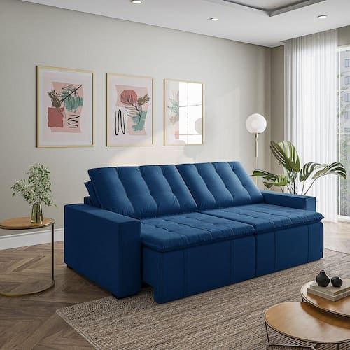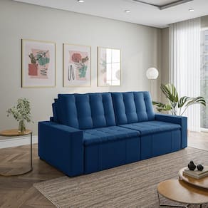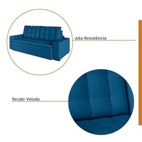 O Sofá Cama Palmeira MadeiraMadeira é a solução perfeita para quem tem pouco espaço disponível. Com ele você poderá acomodar suas visitas com conforto e praticidade. Produzido em madeira maciça de eucalipto, suporta até 400kg. Depois nos conte como foi a experiência de compra e como ficou seu ambiente nos comentários! Acompanha Almofadas extras: Não Almofada do assento: Fixa Almofada do encosto: Removível Altura do assento até o chão: 48 Altura do Encosto: 58 Altura dos Pés: 3 Ambiente Principal: Sala de Estar Complexidade da Montagem: Baixa: pode ser montado por uma pessoa sozinha Cor: Azul Cor do Produto: Azul Densidade do Assento: D-23 Densidade do Encosto: Camadas de Densidades Diferentes Enchimento do Assento: Espuma Enchimento do Encosto: Fibra Siliconada Estilo de Braço: Braços Quadrados Firmeza do Assento: Médio Informações Complementares: Densidade Braço D19. Enchimento do encosto: fibra siliconada com flocos de espuma envolvidas com manta siliconada. Itens Inclusos: 1 Sofá, Kit Ferragens e Manual de Montagem Linha ou Coleção: Palmeira Manual de Montagem e Instalação: https://product-hub-prd.madeiramadeira.com.br/879734/documents/af0868e7-bbe2-4685-861c-120f4ade4d07palmeira240260280bracoreto.pdf Material dos Pés: Polimero Modelo: Retrátil e Reclinável Necessita Montagem: Sim Nível de Conforto: Macio Origem do Produto: Nacional Peso: 93 Pet Friendly: Não Possui Entrada USB: Não Possui Percintas Elásticas: Sim Possui Pés: 08 Possui Rodízio: Sim Profundidade Quando Estendido: 148 Recomendações de Uso, Manutenção e Limpeza: Evitar exposição direta à luz solar, limpar com escova macia e aspirar o pó semanalmente, não utilizar produtos químicos, removedores, alvejantes, etc. Evite exercer pressão excessiva sobre determinada partes do estofado, não utilizar para limpeza equipamentos a vapor de água. Resistente à Chuva: Não Revestimento do Braço: Veludo Rodízio com Trava: Não Sistema de Montagem: Parafusos e Engates Tecido Predominante: Veludo Tipo de Encosto: Regulável Tipo de Mola: Molas Bonnel