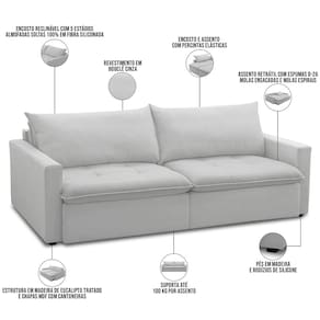 A estrutura fabricada com madeira de eucalipto e MDF garante que este seja um sofá durável e resistente. Já o sistema retrátil permite ajustar facilmente a posição para atender às suas necessidades de relaxamento, seja para assistir um filme, ler um livro ou até mesmo para acomodar as visitas, uma vez que é um sofá cama casal com amplo espaço que garante o máximo de bem-estar. Para completar, o revestimento em linho impermeável evita que sujeiras e, assim, fica com aparência de novo por muito mais tempo.