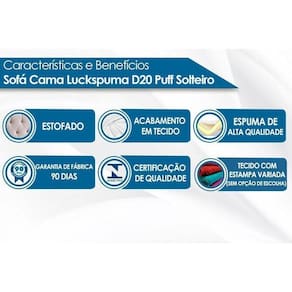Imagens Meramente Ilustrativas. Não nos responsabilizamos pela montagem/instalação dos produtos. Todas as informações divulgadas são de responsabilidade exclusiva do fabricante/fornecedor. Peso Máximo Suportado: 150 kg | Tipo de Estrutura do Móvel: Estofado | Forração de Revestimento Poltrona e Sofá: Tecido | Vantagens Extras Poltrona e Sofá: Almofadas Removíveis do Assento | Garantia Poltrona e Sofá: 3 meses | Nossa Avaliação Poltrona e Sofá: Qualidade Boa | Quantidade de cadeiras: 1 | Tipo de Cama: Sofá Cama | Garantia de Fábrica: Garantia de Fábrica | Suporte de Peso: 10 | Material da Estrutura: MDP | É reclinável: Sim | É kit: Não | Requer montagem: Sim | Este Sofá é Retrátil: Não | É Sofá-Cama: Sim | Material dos Pés: Aço | Tipo de produto: Sofá | Material: Madeira | Unidades por kit: 0 | Desenho do tecido: Big freshness | Tempo de montagem: 1 h | Densidade da espuma do assento: Média | Acessórios incluídos: Manual de instruções | Fonte do produto: N/A | Quantidade de lugares: 1 lugar | Orientação do sofá: Direita | Inclui colchão: Não | Material do estofamento: Bombazina | Mecanismo de abertura do produto: Frontal | Quantidade de posições de reclinado: 1 Posição | Formato do sofá: Em L | Com pés desmontáveis: Não | Estilo: Lawson | Cor dos pés: Ciano | Material das corrediças: Metal | Com tecido removível: Não | Material do assento: Aço inoxidável | Condição do item: Novo | Inclui cama auxiliar: Não | Materiais da estrutura: Madeira | Material de enchimento do encosto: Espuma | Cômodo Indicado: Multiuso | Código universal de produto (GTIN): 7898081966130 | Condição do Item: Novo | Link Site: https://www.costaricacolchoes.com.br/produtos.asp?produto=26228 | Numeral: 0 | Não se Aplica: N/A | Não Possui: Não | Linha/Modelo: Luckspuma | Cor Cnova: Blush | Cor Meli: Ciano | Contatos Sac Fábrica: luckspuma@luckspuma.com.br | Categoria Trilha: Quarto Juvenil e Solteiro> Sofá Cama Solteiro | Categoria - Sub: Sofá Cama Solteiro | Categoria - Pai: Quarto Juvenil e Solteiro | Comprimento Embalagem: 186.00 | Largura Embalagem: 62.00 | Altura Embalagem: 12.00 | Kit: 0 | Peso: 2.77 Kg | Peso Real Kg: 2.77 | Peso Cubado: 35.00 | Volumes: 1 | M3: 0.14 | Comprimento/Profundidade: 62 cm | Largura: 62 cm | Altura: 36 cm | Tamanho Montado: Larg:62.00 x Comp/Prof:62.00 x Alt: 36.00 | Comprimento/Profundidade Montado: 62.00 | Largura Montado: 62.00 | Altura Montado: 36.00 | Data Cadastro: 2023-7-2 0:17:31 | Sigla Estoque: 6 | Marca: Luckspuma