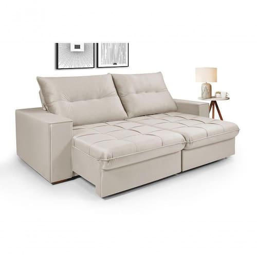 Sofá Retrátil Reclinável Cancún 2,50m com Pillow Top Veludo Sofá retrátil e reclinável com super Pillow Top, espuma D26, molas bonel e percintas italianas. Sofisticação com um design pensado para a vida contemporânea, mesclando a praticidade e o conforto para seu o dia a dia. Um estofado totalmente retrátil e reclinável, seu encosto tem o enchimento com fibra 100% siliconada, revestido no tecido veludo com toque macio e aveludado. Seu encosto reclinável em cinco posições, proporcionando-lhe mais conforto na hora do descanso. Não para por aí: seu assento retrátil conta com espuma D26 com pillow top, transformando seu sofá em uma verdadeira cama para assistir seus esporte/series/filmes favoritos.