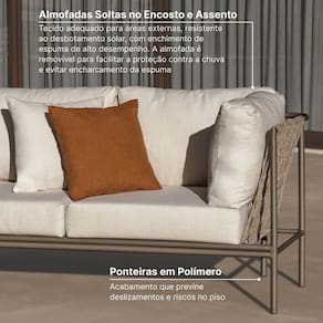 Os tecidos são especialmente selecionados para suportar a exposição solar, mantendo as cores vibrantes e resistentes ao desbotamento. E, para maior praticidade, todas as almofadas são removíveis, pois, apesar do enchimento em espuma de alto desempenho, não devem ser expostas à chuva.
