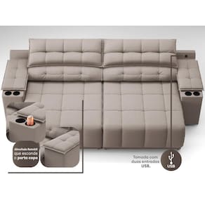 USB:Sofá com uma tomada contendo duas entradas USB para carregamento de eletrônicos, potência de 5V.Não incluso fonte de energia. Extensão do cabo da tomada pode variar de 70cm a 90cm.