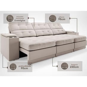 USB:Sofá com uma tomada contendo duas entradas USB para carregamento de eletrônicos, potência de 5V.Não incluso fonte de energia. Extensão do cabo da tomada pode variar de 70cm a 90cm.