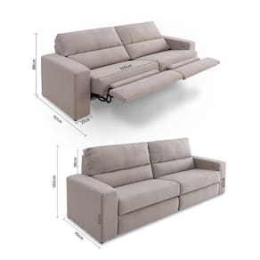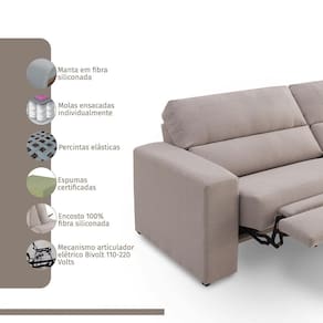 Assentos com espuma flexível de poliuretano densidade 28kg/m, certificada, fabricação própria, coladas sobre molas ensacadas e utilização de feltro como camada isolante, sustentados por percinta elástica e mola espiral. Retrátil com sistema Touch , o que proporciona maior segurança e facilidade ao abrir e fechar o assento. Enchimento do encosto: 100% fibra de poliéster siliconada. Estrutura de madeira maciça de pinus e eucalipto 100% reflorestada. Fixação da estrutura: grampos galvanizados anti-ferrugem. Apoiados no chão com sapatas de pvc. Revestimento/tecido: tipo linho 100% poliéster, com toque macio.