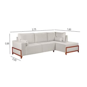 O modelo inclui chaise integrada e almofadas decorativas, que completam o visual com charme e conforto. Os pes em madeira macica tauari adicionam um toque natural e sofisticado, harmonizando facilmente com diferentes estilos de decoracao.
