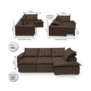 Dimensões do Sofá Montado: Altura: 100 cm Altura do Braço: 23cm Altura do Pillow: 11cm Largura: 270 cm Profundidade do Sofá Fechado: 112 cm Profundidade do Sofá Aberto e da Chase Fixa: 167 cm Peso: 95,97kg