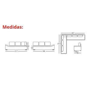 Dimensões do Produto: Altura: 94,00 cm Largura lado direito: 267,00 cm Largura lado esquerdo: 217,00 cm Profundidade: 85,00 cm Peso: 74 kg