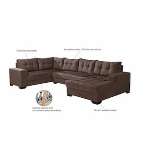 O Sofá de Canto 6 Lugares com Chaise Bia acomoda tranquilamente 6 pessoas, é ideal para deixar sua sala de estar muito mais bonita e convidativa. Confeccionado com madeira reflorestada de pinus, molas, almofadas soltas enchidas com Fibra de Silicone , ele garante maior durabilidade e resistência, conforto para reunir seus familiares. Acompanha Almofadas extras: Não Acompanha Chaise: Acompanha Manual de Instalação: Não Almofada do assento: Fixa Almofada do encosto: Removível Altura do assento até o chão: 46 cm Altura do Encosto: 46 cm Altura dos Pés: 6 cm Ambiente: Sala de Estar Ambiente Principal: Sala de Estar Complexidade da Montagem: Baixa: pode ser montado por uma pessoa sozinha Consistência do Assento: Cor: Marrom Cor: Marrom Densidade do Assento: D-26 Enchimento do Assento: Espuma Enchimento do Encosto: Fibra Siliconada Estilo de Braço: Braços Quadrados Estilo de Cor: Colorido Extensível: Firmeza do Assento: Macio Itens Inclusos: 1 Sofá de Canto com Chaise e Kit de Acessórios Largura do Sofá Maior: 348 cm Linha ou Coleção: Bia Material dos Pés: Madeira Necessita Montagem: Sim Peso: 107 kg Possui Percintas Elásticas: Sim Possui Pés: 12 Possui Rodízio: Não Reclinável: Recomendações de Uso, Manutenção e Limpeza: Não utilizar produtos químicos, usar pano levemente umedecido. Retrátil: Revestimento do Braço: Tecido Sistema de Montagem: Rosqueamento dos pés e encaixe. Suporta Até (kg): 540 kg Tecido Predominante: Suede Tipo de Chaise: Tipo de Encosto: Fixo