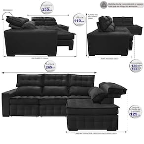 - A Cama inBox fica responsável pelo e do produto adquirido até a porta de entrada ou portaria do cliente. Após a da no solicitado, o até o de ficará sob responsabilidade do cliente, caso neste momento haja problemas ou no produto, ficará a cargo do mesmo. OBS.: As s NÃO SOBEM escadas ou elevadores. Tipo do Sofa: Retrátil e Reclinável | É sofá de canto: Sim | É sofá-cama: Não | Encosto Reclinavel: Sim | Assento Retratil: Sim | Cor: Preto | Tonalidade: Preto | Cor Pincipal: Preto | Cor Via: Preto | Desenho do tecido: Liso | Acessórios incluídos: Não possui | Fabricante: Cama inBox | Quantidade de Lugares: 8 | Peso do Produto: 110 | Altura: 110 | Largura: 265 | Profundidade: 120 | Material do estofado: Madeira , Espuma, Tecido | Estilo: Moderno | Complexidade de Montagem: Média: pode ser montada por mais de uma pessoa leiga | Tempo Estimado de Montagem: 30 | Produto: Sofá | Comodo indicado: Salas | Custo da Manutenção: Baixo | Conservação e Manutenção do Produto: Para maior durabilidade, recomendamos que a limpeza dos estofados com revestimento em tecido, seja feito com aspirador de pó em baixa rotação ou escova com cerdas macias para a eliminação de poeira e pano úmido em água. Não utilizar agentes químicos! | Condição do item: | É kit: Não | Complexidade de Montagem Via: Fácil de Montar | Quantidade de Lugares Via: Acima de 4 Lugares | Material para Filtro: Mola | Estado de Origem: PR | Produto precisa de Montagem? (79): Sim, instalação dos pés | Instruções/Cuidados (44): Para maior durabilidade, recomendamos que a limpeza dos estofados com revestimento em tecido, seja feito com aspirador de pó em baixa rotação ou escova com cerdas macias para a eliminação de poeira e pano úmido em água. Não utilizar agentes químicos! | Conteúdo da Embalagem (45): Sofá | Nome do Simples no Fornecedor: Cama inBox | Altura do Produto com Embalagem: 110 | Peso Produto Com Embalagem: 110 | Largura Produto Com Embalagem: 265 | Comnto Produto Com Embalagem: 120 | Montagem Necessária: Sim, instalação dos pés | Conteúdo do produto: 1 sofá | Instruções do produto: Para maior durabilidade, recomendamos que a limpeza dos estofados com revestimento em tecido, seja feito com aspirador de pó em baixa rotação ou escova com cerdas macias para a eliminação de poeira e pano úmido em água. Não utilizar agentes químicos! | Descrição do Tamanho: 6