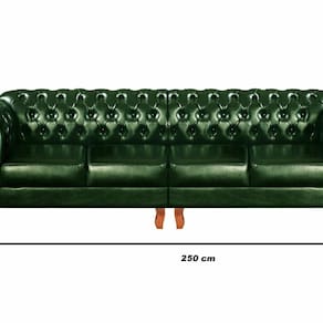 A entrega é realizada no térreo. Produto Montado: Sim Acompanha Almofadas extras: Não Almofada do assento: Fixa Almofada do encosto: Não Possui Altura do assento até o chão: 41.0000 Altura do Encosto: 82 cm Ambiente Principal: Sala de Estar codigo_ean: 7909903688809 Complexidade da Montagem: Baixa: pode ser montado por uma pessoa sozinha Cor: Couríssimo Verde Cor do Produto: Couríssimo Verde Informações Complementares: 120Kg por acento Itens Inclusos: 1 Sofá Bipartido de 4 Lugares (incluindo seus respectivos pés apenas pra enroscar) Linha ou Coleção: Chesterfield Necessita Montagem: Sim Peso: 84 kg Pet Friendly: Não Possui Percintas Elásticas: Sim Possui Pés: 04 Possui Rodízio: Não Recomendações de Uso, Manutenção e Limpeza: Limpeza e cuidados: pode ser utilizado aspirador de pó, escova com cerdas macias ou limpeza a seco. Não utilizar produtos químicos, abrasivos ou limpeza a vapor. Evitar exposição prolongada ao sol. Sistema de Montagem: Enroscar os Pés Suporta Até (kg): 120 kg Tecido Predominante: Couro Sintético Tipo de Encosto: Fixo Tipo de Mola: Não Possui