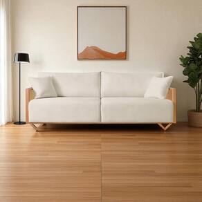 O assento é feito com espuma D28 Soft, e o encosto tem almofadas soltas de fibra 100% siliconada. A estrutura é de madeira reflorestada, e os pés angulados em madeira natural complementam o design. Almofadas decorativas estão incluídas.