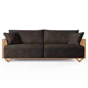 Suas dimensões são: 90cm de altura, 90cm de profundidade e 290cm de comprimento, com braços de 6cm de largura. A estrutura é de madeira reflorestada, e os pés angulados em madeira natural complementam o design.