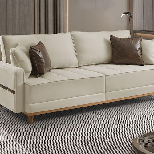 Madeira de eucalipto tratada, molas Bonnel, espuma D-28 Soft, fibra siliconada, tecido linho, madeira maciça (pés).Vendido e entregue por WebContinental