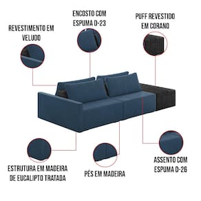 O Sofá Ilha 2 Lugares Living Lary de 232 cm é uma peça de destaque para qualquer ambiente, com um design moderno este sofá apresenta uma estrutura modular permitindo reorganizá-la criando um layout personalizado. Revestido no luxuoso tecido Veludo em um tom envolvente de Azul Marinho, proporcionando uma sensação de aconchego e sofisticação. Seu assento é fixo em espuma D-26 com multimolas de sustentação espiral e ensacadas, solda dupla, manta acrílica e percintas elásticas, suportando até 150 kg por assento. Já o encosto possui espuma D-23 sendo ele removível, com almofadas soltas preenchidas com 100% de fibra siliconada, proporcionando um apoio macio para as costas. Os pés são feitos em madeira certificando maior estabilidade ao móvel. Este sofá apresenta características de alta qualidade, incluindo uma estrutura de madeira tratada de eucalipto reflorestada, garantindo maior resistência e durabilidade ao produto, além de contribuir para a sustentabilidade ambiental. Com cinco assentos no total, um deles revestido em tecido Sintético Pu Preto com detalhes em gomos feito com a técnica de costura pespontos, este sofá oferece espaço suficiente para acomodar confortavelmente até seis pessoas, tornando-o ideal para receber amigos e familiares com estilo e conforto. Pode ser utilizado em escritórios, restaurantes e demais ambientes corporativos.O Sofá Lary é a escolha perfeita para quem busca uma peça de mobiliário que une funcionalidade, conforto e estilo em uma única solução para o seu ambiente. Aproveite!