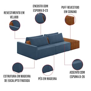 O Sofá Ilha 2 Lugares Living Lary de 252 cm é uma peça de destaque para qualquer ambiente, com um design moderno este sofá apresenta uma estrutura modular permitindo reorganizá-la criando um layout personalizado. Revestido no luxuoso tecido Veludo em um tom envolvente de Azul Marinho, proporcionando uma sensação de aconchego e sofisticação. Seu assento é fixo em espuma D-26 com multimolas de sustentação espiral e ensacadas, solda dupla, manta acrílica e percintas elásticas, suportando até 150 kg por assento. Já o encosto possui espuma D-23 sendo ele removível, com almofadas soltas preenchidas com 100% de fibra siliconada, proporcionando um apoio macio para as costas. Os pés são feitos em madeira certificando maior estabilidade ao móvel. Este sofá apresenta características de alta qualidade, incluindo uma estrutura de madeira tratada de eucalipto reflorestada, garantindo maior resistência e durabilidade ao produto, além de contribuir para a sustentabilidade ambiental. Com cinco assentos no total, um deles revestido em tecido Sintético Pu Nozes com detalhes em gomos feito com a técnica de costura pespontos, este sofá oferece espaço suficiente para acomodar confortavelmente até seis pessoas, tornando-o ideal para receber amigos e familiares com estilo e conforto. Pode ser utilizado em escritórios, restaurantes e demais ambientes corporativos.O Sofá Lary é a escolha perfeita para quem busca uma peça de mobiliário que une funcionalidade, conforto e estilo em uma única solução para o seu ambiente. Aproveite!