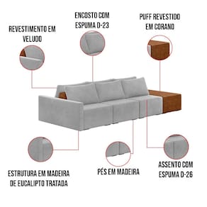 O Sofá Ilha 3 Lugares Living Lary de 312 cm é uma peça de destaque para qualquer ambiente, com um design moderno este sofá apresenta uma estrutura modular permitindo reorganizá-la criando um layout personalizado. Revestido no luxuoso tecido Veludo em um tom envolvente de Cinza, proporcionando uma sensação de aconchego e sofisticação. Seu assento é fixo em espuma D-26 com multimolas de sustentação espiral e ensacadas, solda dupla, manta acrílica e percintas elásticas, suportando até 150 kg por assento. Já o encosto possui espuma D-23 sendo ele removível, com almofadas soltas preenchidas com 100% de fibra siliconada, proporcionando um apoio macio para as costas. Os pés são feitos em madeira certificando maior estabilidade ao móvel. Este sofá apresenta características de alta qualidade, incluindo uma estrutura de madeira tratada de eucalipto reflorestada, garantindo maior resistência e durabilidade ao produto, além de contribuir para a sustentabilidade ambiental. Com sete assentos no total, um deles revestido em tecido Sintético Pu Nozes com detalhes em gomos feito com a técnica de costura pespontos, este sofá oferece espaço suficiente para acomodar confortavelmente até oito pessoas, tornando-o ideal para receber amigos e familiares com estilo e conforto. Pode ser utilizado em escritórios, restaurantes e demais ambientes corporativos.O Sofá Lary é a escolha perfeita para quem busca uma peça de mobiliário que une funcionalidade, conforto e estilo em uma única solução para o seu ambiente. Aproveite!