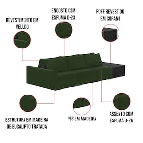 O Sofá Ilha 3 Lugares Living Lary de 342 cm é uma peça de destaque para qualquer ambiente, com um design moderno este sofá apresenta uma estrutura modular permitindo reorganizá-la criando um layout personalizado. Revestido no luxuoso tecido Veludo em um tom envolvente de Verde, proporcionando uma sensação de aconchego e sofisticação. Seu assento é fixo em espuma D-26 com multimolas de sustentação espiral e ensacadas, solda dupla, manta acrílica e percintas elásticas, suportando até 150 kg por assento. Já o encosto possui espuma D-23 sendo ele removível, com almofadas soltas preenchidas com 100% de fibra siliconada, proporcionando um apoio macio para as costas. Os pés são feitos em madeira certificando maior estabilidade ao móvel. Este sofá apresenta características de alta qualidade, incluindo uma estrutura de madeira tratada de eucalipto reflorestada, garantindo maior resistência e durabilidade ao produto, além de contribuir para a sustentabilidade ambiental. Com sete assentos no total, um deles revestido em tecido Sintético Pu Preto com detalhes em gomos feito com a técnica de costura pespontos, este sofá oferece espaço suficiente para acomodar confortavelmente até oito pessoas, tornando-o ideal para receber amigos e familiares com estilo e conforto. Pode ser utilizado em escritórios, restaurantes e demais ambientes corporativos.O Sofá Lary é a escolha perfeita para quem busca uma peça de mobiliário que une funcionalidade, conforto e estilo em uma única solução para o seu ambiente. Aproveite!