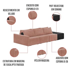 O Sofá Ilha 3 Lugares Living Lary de 372 cm é uma peça de destaque para qualquer ambiente, com um design moderno este sofá apresenta uma estrutura modular permitindo reorganizá-la criando um layout personalizado. Revestido no luxuoso tecido Veludo, proporcionando uma sensação de aconchego e sofisticação. Seu assento é fixo em espuma D-26 com multimolas de sustentação espiral e ensacadas, solda dupla, manta acrílica e percintas elásticas, suportando até 150 kg por assento. Já o encosto possui espuma D-23 sendo ele removível, com almofadas soltas preenchidas com 100% de fibra siliconada, proporcionando um apoio macio para as costas. Os pés são feitos em madeira certificando maior estabilidade ao móvel. Este sofá apresenta características de alta qualidade, incluindo uma estrutura de madeira tratada de eucalipto reflorestada, garantindo maior resistência e durabilidade ao produto, além de contribuir para a sustentabilidade ambiental. Com sete assentos no total, um deles revestido em tecido Sintético Pu Preto com detalhes em gomos feito com a técnica de costura pespontos, este sofá oferece espaço suficiente para acomodar confortavelmente até oito pessoas, tornando-o ideal para receber amigos e familiares com estilo e conforto. Pode ser utilizado em escritórios, restaurantes e demais ambientes corporativos.O Sofá Lary é a escolha perfeita para quem busca uma peça de mobiliário que une funcionalidade, conforto e estilo em uma única solução para o seu ambiente. Aproveite!