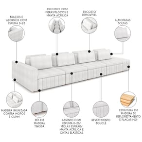 Esse Sofá Living combina elegância de forma única. Feito com madeira de reflorestamento e MDF, ele oferece uma estrutura robusta e durável, enquanto as cintas elásticas no assento e molas espirais garantem um relaxamento incomparável. Com espumas de alta densidade, D-26 no assento, D-23 nos braços e adornos. Este Sofá Cama oferece um conforto notável, perfeito para momentos de relaxamento. O revestimento em bouclê adiciona um toque de elegância e sofisticação, elevando o estilo de qualquer ambiente. Além de ser modulado com encostos removíveis e almofadas soltas permitindo a flexibilidade necessária para seu dia a dia. O Sofá com Puff é um charme, tendo mais assentos para momentos relaxantes, para receber amigos e familiares em um ambiente aconchegante. É a combinação perfeita para quem busca um móvel que se destaque em qualquer decoração. A estabilidade é assegurada pelos pés em madeira tingidos, que também simplificam a montagem.