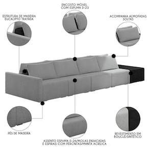 Com seu design modular, você pode personalizar o layout de acordo com sua preferência. O sofá é revestido em Boucle, porém tem um detalhe especial, o puff e encosto são com revestimento sintético, a composição de texturas perfeita para qualquer ambiente. Já o encosto móvel acrescenta versatilidade e conforto, permitindo que você relaxe com estilo. Fabricado com altos padrões, esse Sofá Modular exala elegância e sofisticação, seja na sua Sala de Estar, em um canto aconchegante ou em Ambientes Integrados. Enfim, quer esteja organizando uma reunião ou simplesmente relaxando, esse Sofá Ilha Com Puff é a peça central perfeita para uma momentos empolgantes.