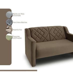 Assentos com espuma flexível de poliuretano densidade 26kg/m, certificada, fabricação própria, sustentados por percinta elástica. Enchimento do encosto: 100% fibra siliconadas. Estrutura de madeira maciça de pinus e eucalipto 100% reflorestada. Fixação da estrutura: grampos galvanizados anti-ferrugem. Apoiados no chão com sapatas de pvc. Revestimento/tecido: veludo 100% poliéster, com toque macio.