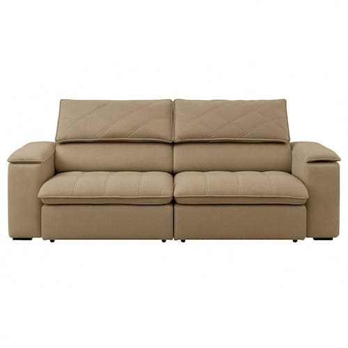 Encosto: Reclinavel com catraca metalica de 5 posicoes, para ajuste personalizado. Almofadas com enchimento em fibra siliconada, garantindo maciez e um visual sempre impecavel. Bracos: Confeccionados com espuma D14, oferecem conforto e leveza ao design do movel. Pes: Em madeira, que conferem um acabamento elegante e reforcam a firmeza do sofa. Acabamento: Revestimento interno e externo em TNT preto, que protege a estrutura e oferece um toque final discreto e sofisticado. Garantia: 3 meses contra defeitos de fabricacao.