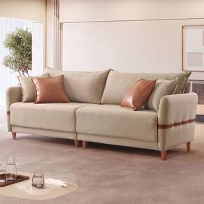 Este sofá estofado em linho exala sofisticação e conforto, complementado por um elegante detalhe em courino nos braços. Duas almofadas em linho proporcionam suavidade e aconchego, enquanto duas almofadas em courino acrescentam um toque moderno e distinto. Ideal para quem busca um mobiliário que une estilo e funcionalidade, é a escolha perfeita para qualquer ambiente. Produto Montado: Sim Acompanha Almofadas extras: 04 Almofada do assento: Fixa Almofada do encosto: Removível Altura do assento até o chão: 45.0000 Altura do Encosto: 94 cm Ambiente Principal: Sala de Estar codigo_ean: 7909903856024 Complexidade da Montagem: Baixa: pode ser montado por uma pessoa sozinha Cor: Bege Cor do Produto: Bege Itens Inclusos: 1 sofá living. Linha ou Coleção: Canela Marca: Lufer Estofados Material dos Pés: Madeira Maciça Necessita Montagem: Sim Peso: 61,5 kg Pet Friendly: Não Possui Percintas Elásticas: Não Possui Pés: 08 Possui Rodízio: Não Recomendações de Uso, Manutenção e Limpeza: Um pano seco e um pano levemente umedecido, evitar alvejantes e produtos de limpeza. Sistema de Montagem: Encaixe. Suporta Até (kg): 120 kg Tecido Predominante: Linho Tipo de Encosto: Fixo