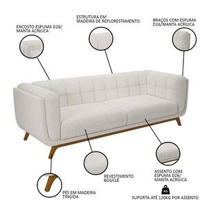 Características do Produto Material da estrutura: Madeira de Reflorestamento. Material do Assento: Espuma D26/Manta Acrílica. Material do Encosto: Espuma D26/Manta Acrílica. Revestimento: Bouclê. Peso Suportado: 120 kg por assento. Quantidade de Assento: 2 Assentos. Quantidade de Lugares: 2 Lugares. Tipo de Encosto: Fixo. Tipo de Assento: Fixo. Possui Pés: Sim. Material dos Pés: Pés em Madeira Tingida. Altura dos Pés: 16 cm. É retrátil: Não. É reclinável: Não. É bipartido: Não. Diferenciais: - Design moderno. - Estrutura com madeira imunizada contra mofo, cupim e micro-organismos. - Assento e encosto com cintas elásticas de sustentação de alta resistência. - Braças com espuma D16 e adornos com espuma D14. Sistema de Montagem: Apenas fixação dos pés. Manual de Montagem: Não. Volumes: 1 Volume. Conteúdo da Embalagem: 1 Sofá. Garantia do Fabricante: 90 dias contra defeito de fabricação. Montagem: Recomendamos que seja feita por um profissional. Recomendação de Limpeza: Utilize pano levemente úmido.