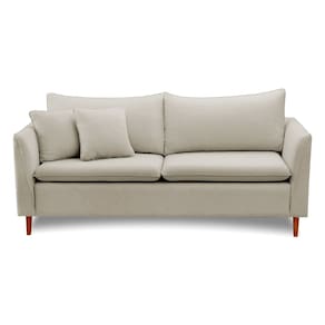 Sofá em veludo de toque macio, disponível em . Possui assento fixo com pillow top em espuma D26, estrutura reforçada em madeira de eucalipto com mola bonnel e percintas italianas. Conta com pés removíveis, encosto em fibra de silicone e acompanha almofadas decorativas.
