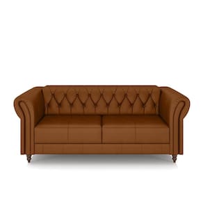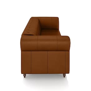 O revestimento em couro confere um aspecto luxuoso e elegante, refletindo o estilo clássico Chesterfield. Seus pés torneados fixos, em madeira maciça, adicionam um charme adicional e garantem estabilidade.