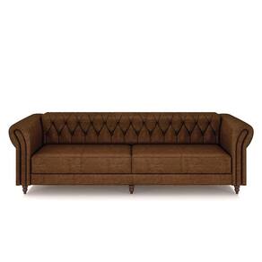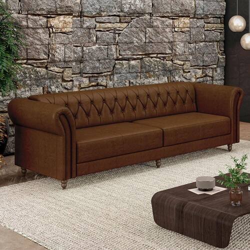 O revestimento em couro confere um aspecto luxuoso e elegante, refletindo o estilo clássico Chesterfield. Seus pés torneados fixos, em madeira maciça, adicionam um charme adicional e garantem estabilidade.