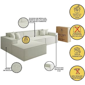 Seu estofado em tecido bouclê macio, estrutura reforçada e chaise integrada proporcionam um visual moderno e aconchegante para compor qualquer ambiente com elegância e praticidade. Perfeito para quem valoriza conforto sem abrir mão de espaço.