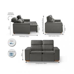 O Sofá Luxemburgo 2 Lugares é fabricado com material de alta qualidade retrátil e reclinável possui estrutura em madeira eucalipto reflorestada. Assento retrátil de ferro com pillow, espuma de densidade D33, Coberto com manta acrílica TNT resinado e molas, o revestimento em tecido Veludo Nobre e pés de madeira. Conta com percintas elásticas italiana em sua estrutura que confere maior durabilidade e resistência por mais tempo. Vai deixar o ambiente muito mais aconchegante e perfeito para relaxar e descansar. Acompanha Almofadas extras: Não Almofada do assento: Fixa Almofada do encosto: Removível Altura do assento até o chão: 47,5 Altura do Encosto: 95 Altura dos Pés: 5 Ambiente Principal: Sala de Estar Complexidade da Montagem: Baixa: pode ser montado por uma pessoa sozinha Cor: Cinza Cor do Produto: Cinza Densidade do Assento: D-33 Densidade do Encosto: Camadas de Densidades Diferentes Enchimento do Assento: Espuma Enchimento do Encosto: Fibra Siliconada Estilo de Braço: Braços Quadrados Firmeza do Assento: Firme Informações Complementares: Itens Inclusos: 1 Sofá Largura do Sofá Maior: Linha ou Coleção: Luxemburgo Manual de Especificação Técnica: Manual de Montagem e Instalação: https://cdn2.madeiramadeira.com.br/atributo/lr-do-brasil/938025-sofa-luxemburgo-esse-manual.pdf Material dos Pés: Madeira Montagem Flex: Necessita Montagem: Sim Origem do Produto: Nacional Peso: 42,22 Pet Friendly: Não Possui Percintas Elásticas: Sim Possui Pés: 04 Possui Rodízio: Sim Profundidade Quando Estendido: 135 Recomendações de Uso, Manutenção e Limpeza: Não utilizar nenhum produto químico: ácido, água sanitária, álcool, solvente e etc. Faça limpeza apenas com pano branco úmido com água e sabão neutro Resistente à Chuva: Revestimento do Braço: Veludo Rodízio com Trava: Não Sistema de Montagem: Encaixe Suporta Até (kg): 200 Tecido Predominante: Veludo Tipo de Encosto: Regulável Tipo de Madeira Maciça da Estrutura: Tipo de Mola: Molas Bonnel