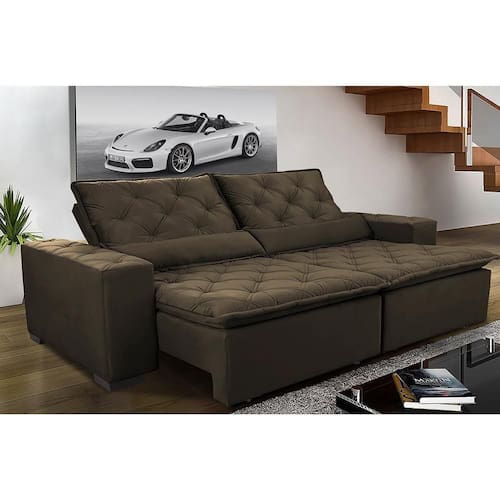 Sofá Magnum 2,42m Retrátil, Reclinável Com Molas E Almofadas Lombar Tecido Suede Velusoft Café Chegou o Maravilhoso Sofá Magnum. O que o torna especial são assentos com espuma D33 envolvidas em fibra Siliconada Compactada para que tenha um toque gostoso e aconchegante, além de seu maravilhoso designer com costuras duplas e puxes que o embelezam, proporcionando conforto de um colchão em um Belíssimo Sofá. Sua sala jamais será como antes!