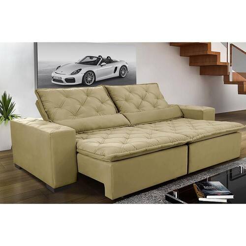 Sofá Magnum 2,62m Retrátil, Reclinável Com Molas E Almofadas Lombar Tecido Suede Velusoft Bege Chegou o Maravilhoso Sofá Magnum. O que o torna especial são assentos com espuma D33 envolvidas em fibra Siliconada Compactada para que tenha um toque gostoso e aconchegante, além de seu maravilhoso designer com costuras duplas e puxes que o embelezam, proporcionando conforto de um colchão em um Belíssimo Sofá. Sua sala jamais será como antes!