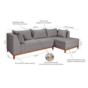 Cor: Linho | Altura: 95 | Peso do Produto: 70 | Garantia do Fabricante: 3 | Tonalidade: Bege | Cômodo Indicado: Salas | Produto: Sofá | Tipo de Tecido: Linho | Quantidade de Lugares: 3 | Complexidade de Montagem: Baixa: pode ser montado por uma pessoa leiga | Conservação e Manutenção do Produto: Não utilizar produtos químicos | Largura: 280 | Tipo do Sofá: com Chaise | Capacidade de Peso: 300 | Tempo Estimado de Montagem: 5 | Comprimento: 280 | Assento Retrátil: Não Retrátil Cor: Linho 199
