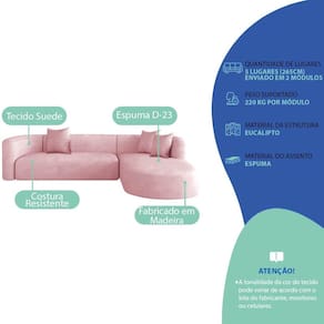 - Tipo do Assento e Encosto: Estofados com espuma de alta densidade (D-23). Produto Montado: Não Acompanha Almofadas extras: Não Almofada do assento: Fixa Almofada do encosto: Fixa Altura do assento até o chão: 45.0000 Altura do Encosto: 25 cm Altura dos Pés: 2 cm Altura Máxima dos Pés: 2.0000 Ambiente Principal: Sala de Estar Bipartida: Sim codigo_ean: 7900288316288 Consistência do Assento: Macio Cor: Rosa Bebê Cor do Produto: Rosa Bebê Densidade do Assento: D-23 Densidade do Encosto: D-23 Enchimento do Assento: Espuma Enchimento do Encosto: Espuma Estilo de Braço: Sem Braços Firmeza do Assento: Macio Itens Inclusos: 1 Sofá Lado da Quina (Visto de Frente): Direito Lado do Sofá de Canto: Lado Maior à Esquerda Linha ou Coleção: Celinne Luxuoso Marca: Maranata Estofados Material dos Pés: PVC Modelo do Sofá: Sofá Bipartido Necessita Montagem: Não Nível de Conforto: Macio Origem do Produto: Nacional Peso: 85 kg Pet Friendly: Não Possui Baú: Não Possui Mola: Não Possui Percintas Elásticas: Sim Possui Pés: 08 Possui Rodízio: Não Quantidade de Itens: 2 Recomendações de Uso, Manutenção e Limpeza: Limpar com flanela limpa e seca. Não molhar o móvel e não expor em lugar úmido ou próximo de fontes de calor. Não usar produtos abrasivos. Suporta Até (kg): 220 kg Tecido Impermeável: Não Tecido Predominante: Suede Tipo de Encosto: Fixo Tipo de Mola: Não Possui Tipo de Sofá: Sofá de Canto Marca: Não Informado
