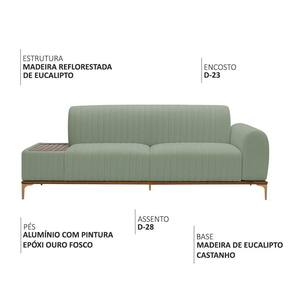 Características TécnicasEstrutura: Madeira reflorestada de eucalipto, com partes em MDF e OSB robustez e sustentabilidadeAssento: Espuma D-26 HR sobre percintas elásticas conforto firme e duradouroEncosto: Espuma D-23 sobre percintas elásticas apoio ergonômicoBraços: Espuma D-23 maciez e suporteMesa: Estrutura em madeira de eucalipto com bordas estofadas e tampo envernizadoBase/Pés: Madeira de eucalipto envernizada com pés em alumínio com pintura epóxiCor da Base/Pés: Castanho Natural / Ouro FoscoPeso Suportado: Até 100 kg por assento